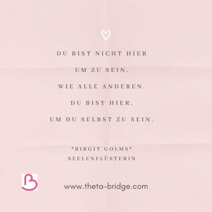 Birgit Golms ist ThetaHealerin, Mentorin und Seelenflüsterin. Sie hilft Menschen dabei, ihren Seelenauftrag zu erkennen und ihre wahre Bestimmung zu leben. Dazu nutzt sie ihre Gaben, mit der Seele zu kommunizieren und den Seelenplan intuitiv zu erkennen. Mit ihrem Gruppen-Coaching-Programm unterstützt sie Frauen dabei, ihre Bestimmung zu erkennen und in die Welt zu bringen, auch in Form eines Soulbusiness. Als ThetaHealerin begleitet sie mit Gruppenheilungen in der Zeit des Wandels und bildet aus. Nähere Informationen auf Birgits Website unter www.theta-bridge.com.